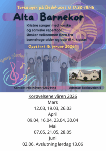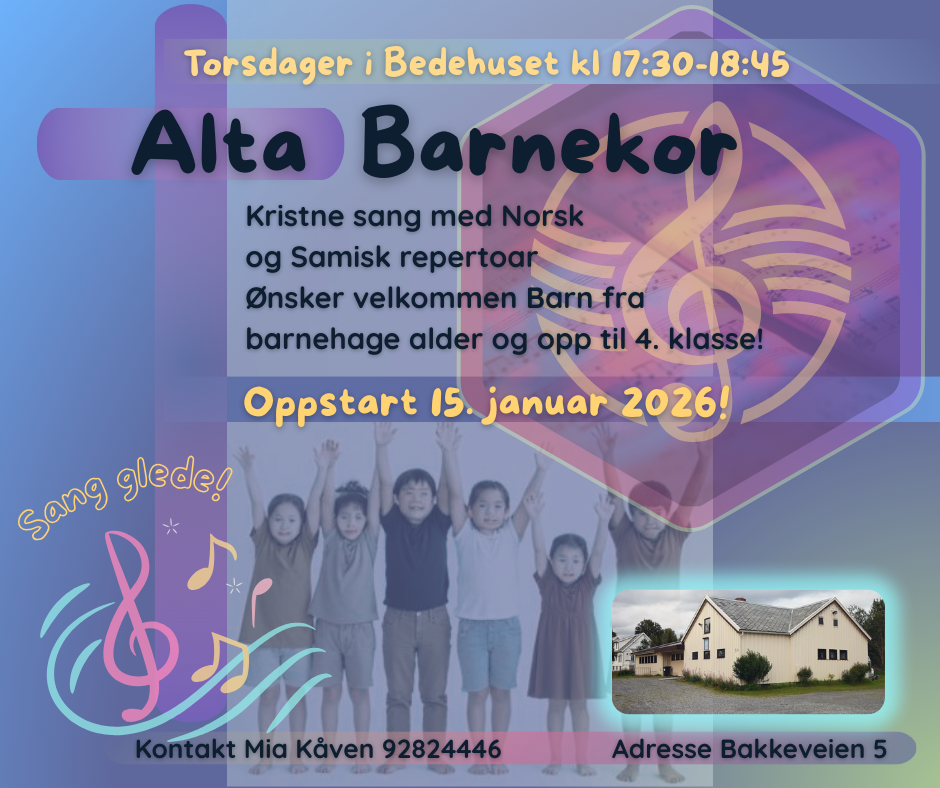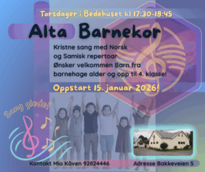 Vi starter med et nytt kortilbud på Alta Bedehus. Her får barna mulighet til å lære sanger blant gode gamle søndagskolefavoritter og noen nyere gospelbarnesanger. Her skal vi synge både på norsk og samisk, og det tilpasses alt etter hva ungene selv behersker! Aldersgruppen er for barn fra barnehagealder og opp til 4. klasse. Vi samles hver torsdag på Alta Bedehus i Bakkeveien 5, klokken 17:30-18:45. Oppstart blir den 15. januar 2026 og følger skoleruten i Alta. Samlingene avsluttes med noe å bite i, frukt, snax, saft, lek og felleskap.