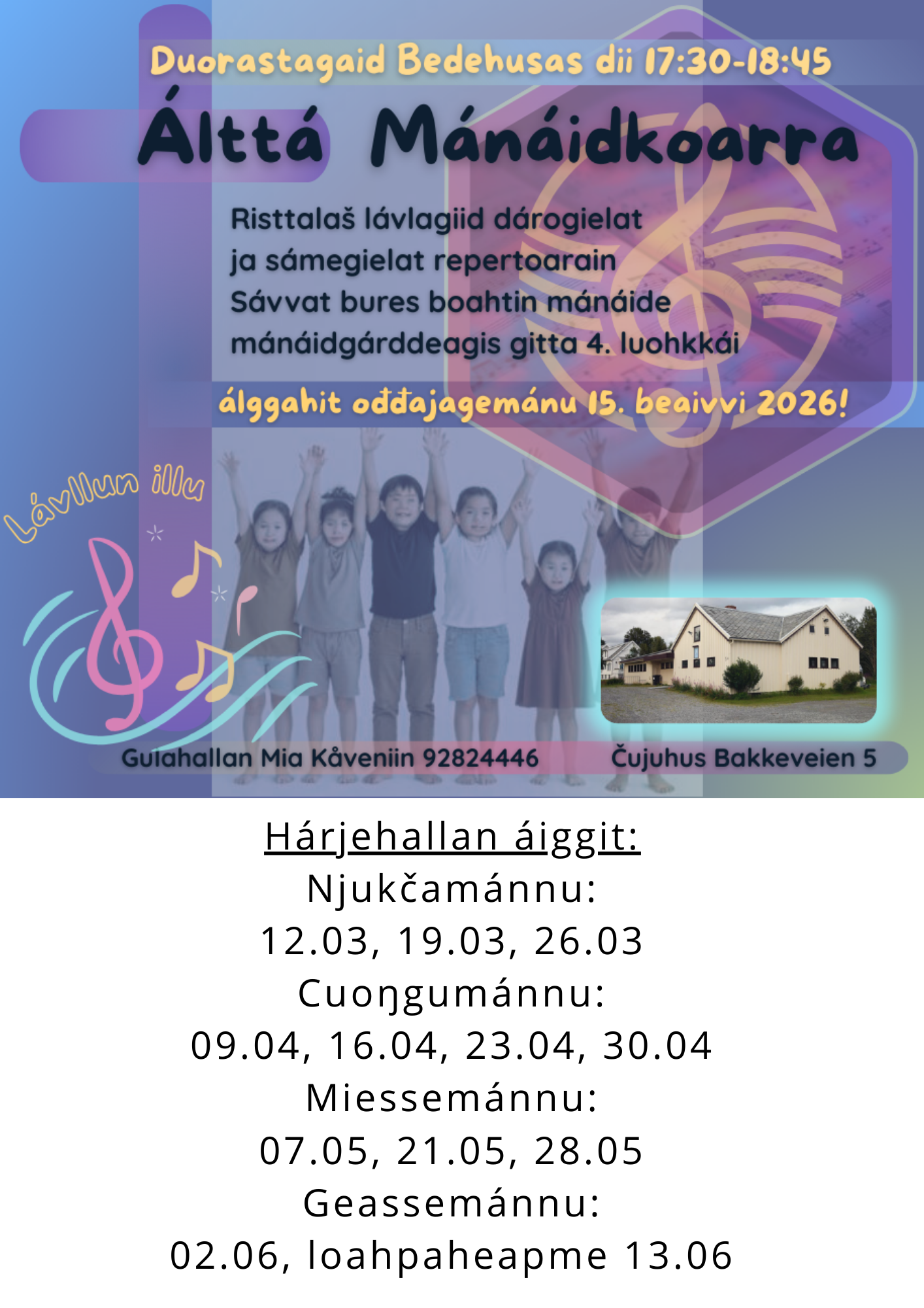 Mii álggahit ođđa koarra fálaldaga Álttá Bedehusas. Dáppe ožžot mánát vejolašvuođa oahppat lávlagiid buori dološ sotnabeaiskuvlla favorihtain ja muhtin ođđaseabbo gospel-mánáidlávlagiin. Lávlut sihke dárogillii ja sámegillii, ja dat heivehuvvo dan mielde maid mánát ieža máhttet! Fálaldat lea mánáide mánáidgárddeagi rájes gitta 4. luohkkái. Mii deaivvadit juohke duorastaga Álttá Bedehusas Bakkeveien 5:s, diibmu 17:30-18:45. Álggahit ođđajagemánu 15. beaivvi 2026:s ja čuovvut Álttá skuvlaruvtto. Čoahkkimiid loahpas fállojuvvo biebmu, šattuid, sneavssat, sákta, stoahkan ja ovttastallan.